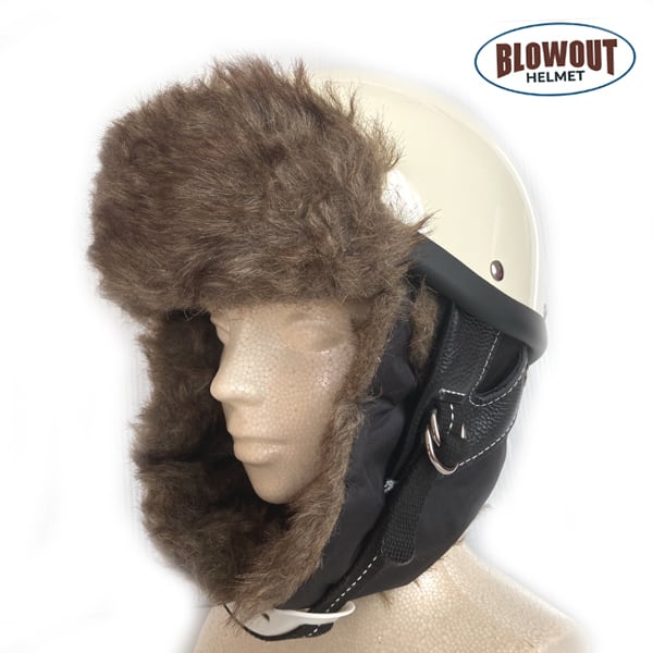 カラーブラック、真冬のハーフヘルメットは、顔周耳が寒いですが中綿入り&ファー付きで頬まで温かいので